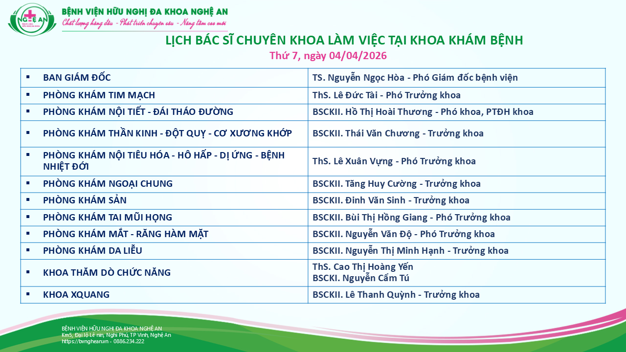 Thông báo lịch bác sĩ chuyên khoa làm việc tại khoa Khám bệnh – Bệnh viện Hữu nghị đa khoa Nghệ An, Thứ 7, Ngày 28/03/2026 Thời gian làm việc: Buổi sáng: 7h00 -12h00 Buổi chiều: Nghỉ —————————————————————————————————————————————————————————————————————————— Để đặt lịch khám và tìm hiểu thông tin, xin vui lòng liên hệ Bệnh viện Hữu […]