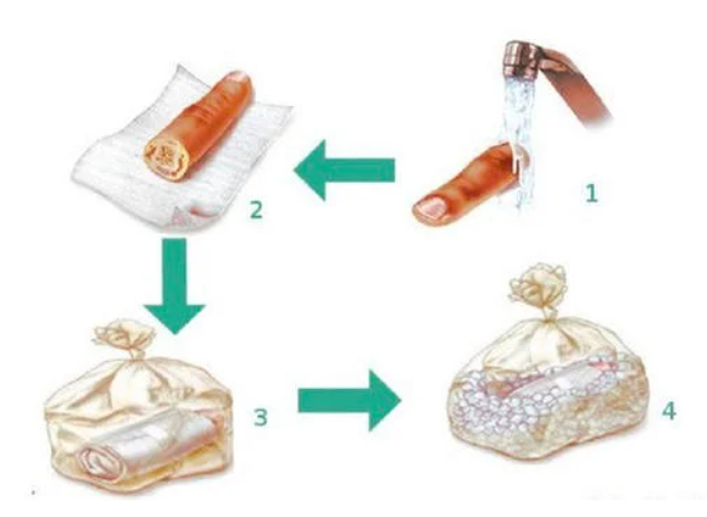 – Đặt phần chi đứt rời vào túi nilon có chứa nước muối sinh lý (có thể bọc gạc ẩm nước muối sinh lý trước khi cho vào túi nilon).