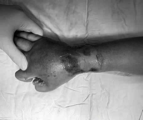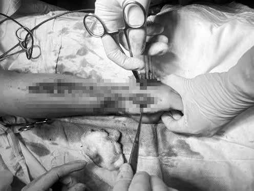 • Tình trạng hiện tại: Dù đã được phẫu thuật cấp cứu rạch mở khoang để giải áp, nhưng bàn tay phải vẫn tím tái, hồi lưu máu rất kém và thoát dịch nhiều.