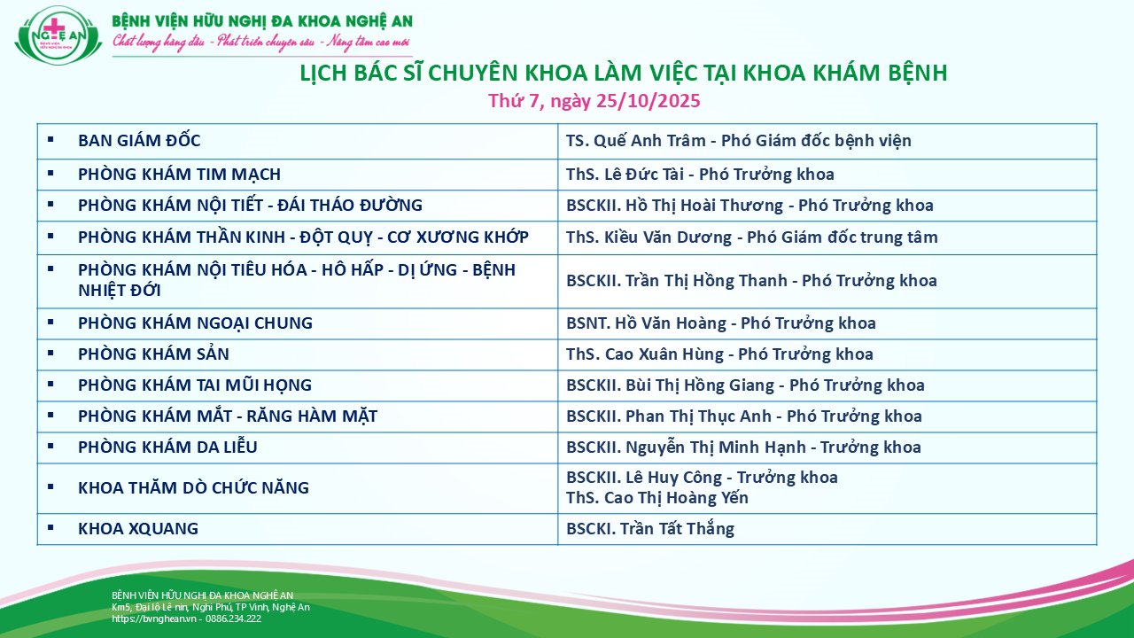 Thời gian làm việc: Buổi sáng: 7h00 -12h00 Buổi chiều: Nghỉ ————————————————————— Để đặt lịch khám và tìm hiểu thông tin, xin vui lòng liên hệ Bệnh viện Hữu nghị Đa khoa Nghệ An. Chất lượng hàng đầu – Phát triển chuyên sâu – Nâng tầm cao mới. Giấy phép hoạt động số 0188/SYT-GPHĐ Địa […]