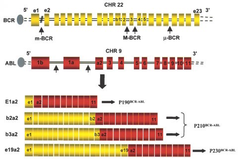 Hình 1.1 Vị trí của các điểm gãy trong gen ABL và BCR và cấu trúc của các bản sao mRNA chimeric BCR/ABL được tạo ra từ các điểm gãy khác nhau (Nguồn: Salesse, S., Verfaillie, C. BCR/ABL: from molecular mechanisms of leukemia induction to treatment of chronic myelogenous leukemia. Oncogene 21, 8547–8559).