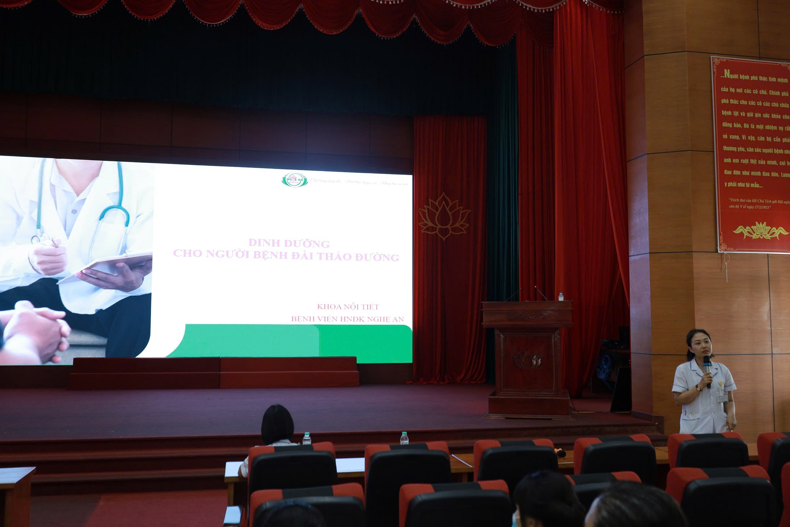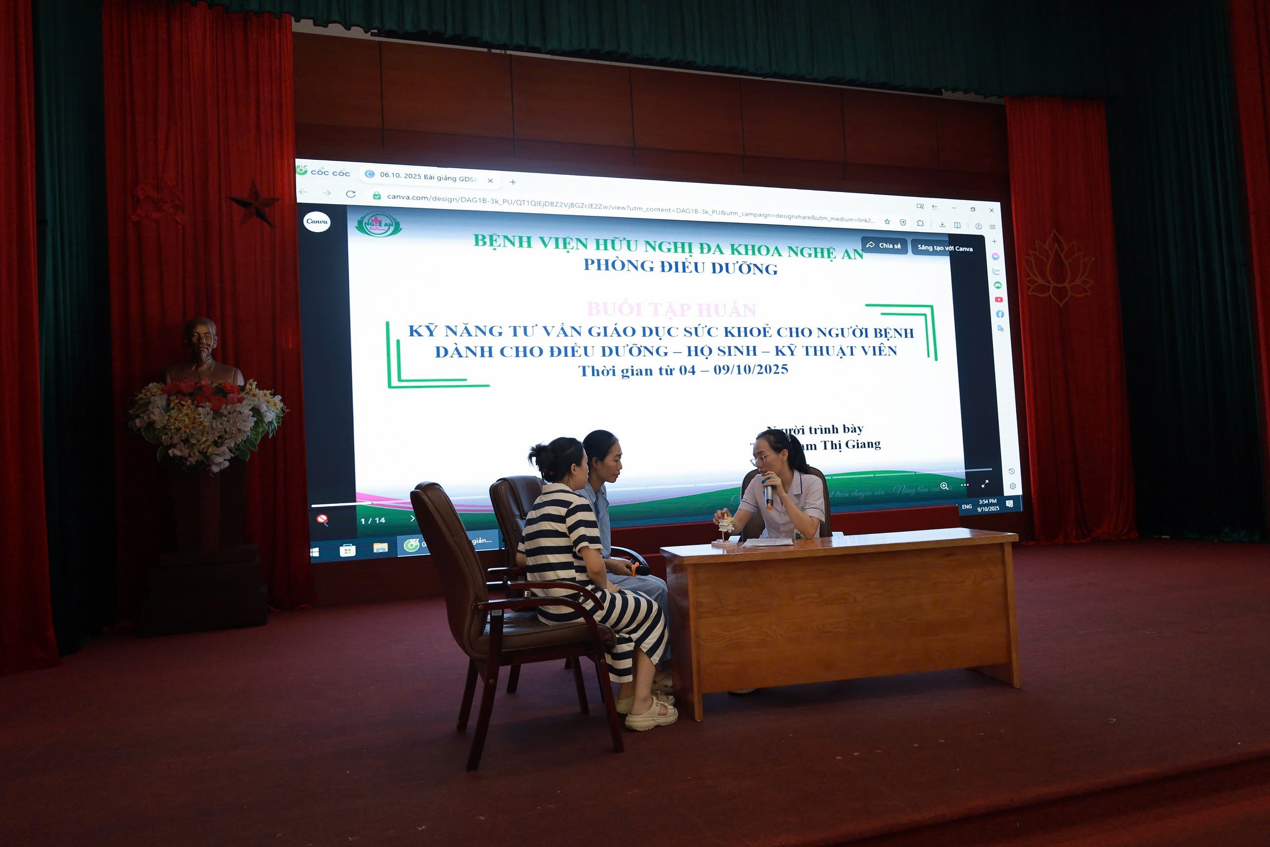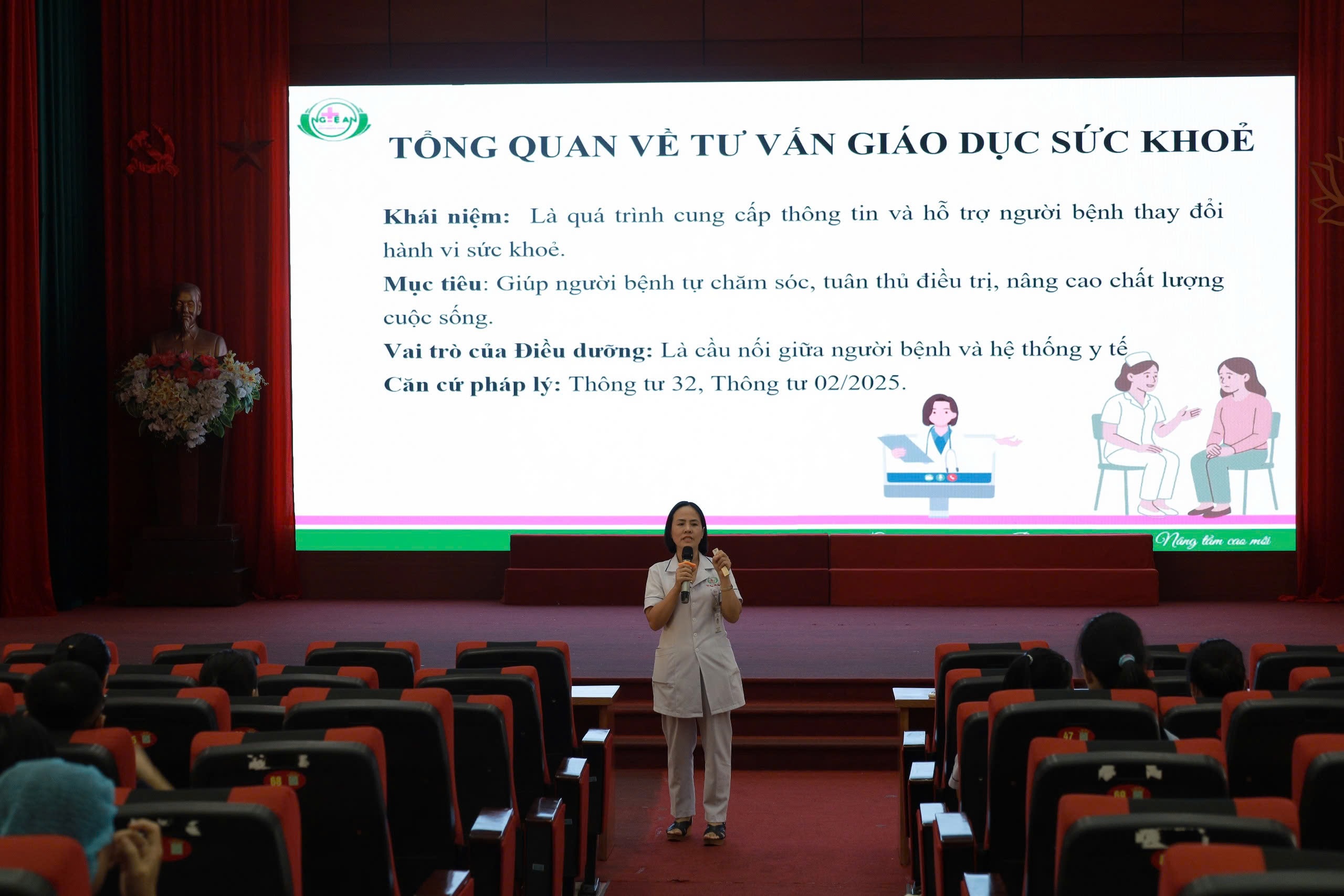 Giảng viên giảng dạy là Thạc sĩ Phạm Thị Giang, Trưởng phòng Điều dưỡng Bệnh viện Hữu nghị Đa khoa Nghệ An – người có nhiều năm kinh nghiệm trong công tác quản lý, đào tạo và định hướng phát triển đội ngũ điều dưỡng viên.Trong buổi tập huấn, ThS. Phạm Thị Giang đã trình bày tổng quan về khái niệm, vai trò, mục tiêu và nguyên tắc của hoạt động tư vấn –giáo dục sức khỏe. Bằng việc dẫn chứng từ thực tế chăm sóc người bệnh tại Bệnh viện Hữu nghị Đa khoa Nghệ An, giảng viên đã chỉ rõ tầm quan trọng của việc tư vấn đúng, đủ, phù hợp với đặc điểm bệnh lý và tâm lý từng đối tượng người bệnh. Một lời động viên chân thành, một lời giải thích cặn kẽ, một hướng dẫn tỉ mỉ… đôi khi lại chính là “liều thuốc tinh thần” giúp người bệnh an tâm, hợp tác điều trị, và góp phần giảm tải cho hệ thống y tế. Giảng viên nhấn mạnh, tư vấn – GDSK không chỉ là việc “nói cho người bệnh biết”, mà là một quá trình tương tác hai chiều, đòi hỏi điều dưỡng viên phải thấu hiểu, đồng cảm, lắng nghe và điều chỉnh nội dung, cách thức truyền đạt sao cho phù hợp với từng hoàn cảnh cụ thể.