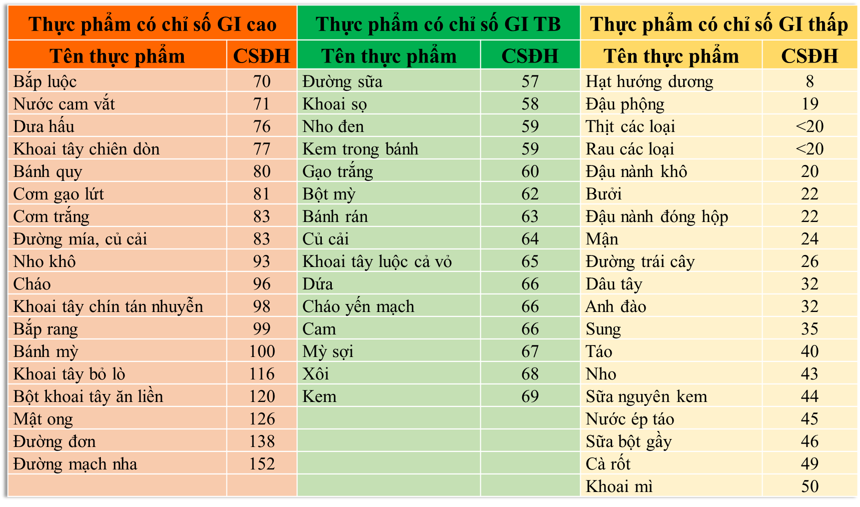 – Carbohydrate (chất bột đường): chiếm khoảng 50–60% tổng năng lượng khẩu phần/ngày. Nên ưu tiên các thực phẩm có chỉ số đường huyết và tải lượng đường huyết thấp, giúp hạn chế tăng đường huyết sau ăn như: ngũ cốc nguyên hạt, ngũ cốc hỗn hợp, rau không chứa tinh bột, các loại đậu nguyên hạt (đậu nành, đậu lăng), rau trộn (salad).