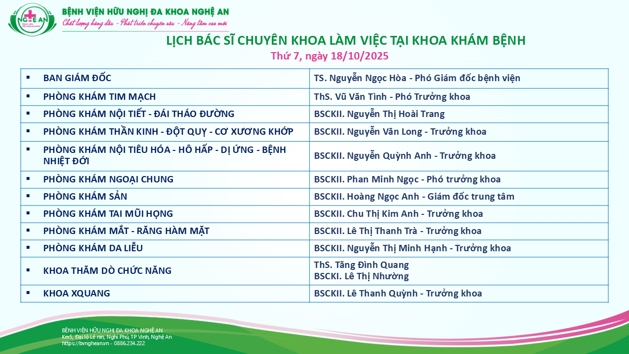 Thông báo lịch bác sĩ chuyên khoa làm việc tại khoa Khám bệnh, Bệnh viện Hữu nghị đa khoa Nghệ An, Thứ 7, ngày 18/10/2025