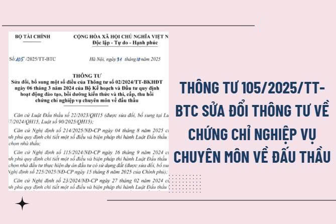 Ngày 31/10/2025, Bộ Tài chính đã ban hành Thông tư số 105/2025/TT-BTC nhằm sửa đổi, bổ sung một số điều của Thông tư số 02/2024/TT-BKHĐT ngày 6/3/2024 của Bộ Kế hoạch và Đầu tư, quy định hoạt động đào tạo, bồi dưỡng kiến thức và và thi, cấp, thu hồi chứng chỉ nghiệp vụ chuyên môn về đấu thầu. Việc ban hành Thông tư này được đánh giá là một bước đi quan trọng, góp phần hoàn thiện hành lang pháp lý trong công tác quản lý, đào tạo và cấp chứng chỉ nghiệp vụ về đấu thầu, phù hợp với yêu cầu thực tiễn, xu hướng chuyển đổi số, cũng như chủ trương cải cách thủ tục hành chính của Chính phủ trong giai đoạn hiện nay.