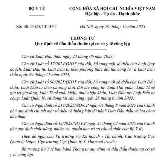 Ngày 25/10 /2025, Bộ Y tế đã chính thức ban hành Thông tư số 40/2025/TT-BYT quy định về đấu thầu thuốc tại các cơ sở y tế công lập. Văn bản này có hiệu lực kể từ ngày ký và thay thế Thông tư 07/2024/TT-BYT trước đó. Việc ban hành Thông tư mới nhằm hoàn thiện hành lang pháp lý, nâng cao hiệu quả, tính công khai và minh bạch trong hoạt động mua sắm, đấu thầu thuốc của hệ thống y tế công lập trên toàn quốc.