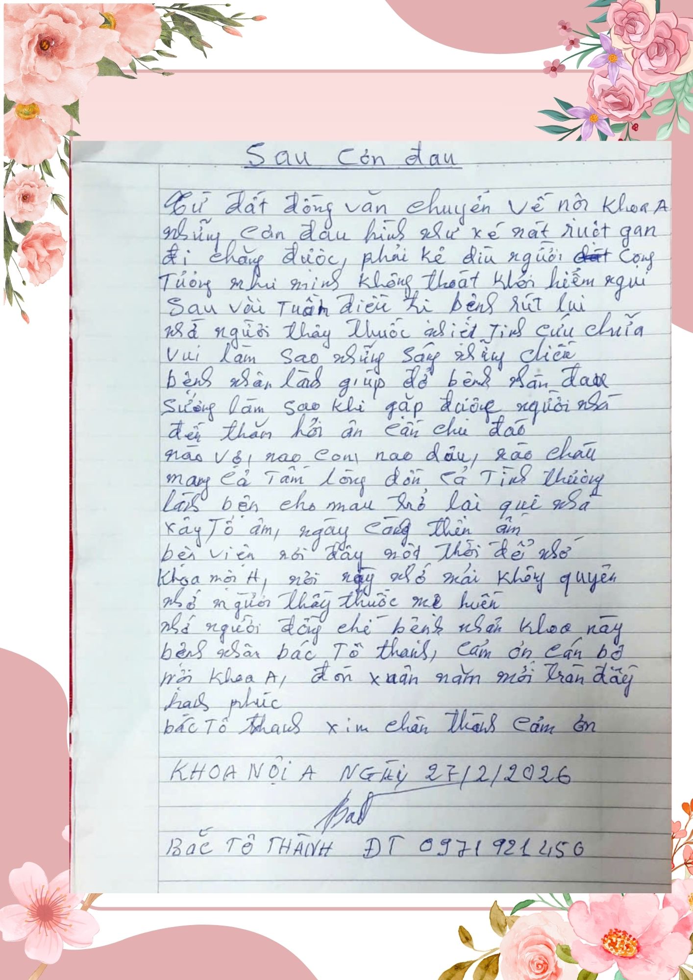 Thư cảm ơn của bệnh nhân gửi đến các y bác sĩ khoa Nội A – Lão khoa, Bệnh viện Hữu nghị đa khoa Nghệ An.